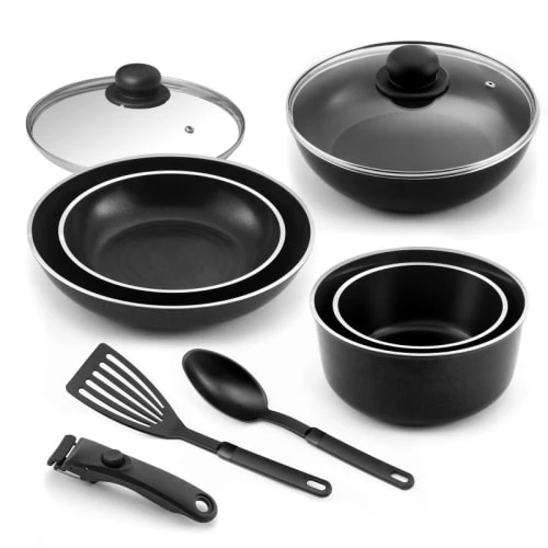 Lot 10 pièces comprenant 2 poêles Ø 22-28cm, 2 casseroles Ø 16-20cm, 1 sauteuse Ø 24cm, 2 couvercles Ø 20-24cm, 1 poignée amovible, 1 spatule et 1 cuillère de service de la gamme Cuisal par Cuisinox.Fabriquée en France, la gamme Cuisal est facile à nettoyer grâce à son revêtement de haute qualité à l’intérieur et à l’extérieur. La base de diffusion assure une répartition optimale de la chaleur pour des résultats de cuisson homogènes et délicieux. Gamme compatible tous feux, y compris induction.Crée en 1967 par Jean Couzon, la marque Cuisinox s’adresse aux amateurs de cuisine et de gastronomie. Les gammes Cuisinox offrent l’un des meilleurs rapport qualité / prix du marché. Les ustensiles de cuisine sont conçus avec les meilleurs matériaux qui garantissent l’excellence de leurs propriétés de cuisson et leur durée dans le temps.