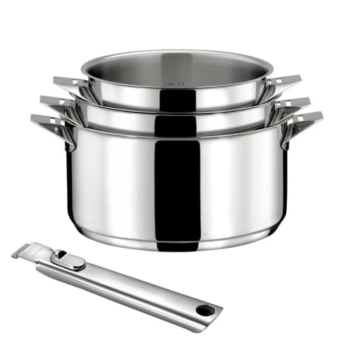 Série de 3 casseroles en inox, de diamètres 16, 18 et 20cm. Fond encapsulé de 6mm d’épaisseur pour une parfaite répartition de la chaleur, sur tous types de feux. Bord ourlé pour verser sans goutter. Série accompagnée d’une poignée amovible ventilée, athermique et tout acier avec système de clipsage sécurisé.Elégante et dynamique, la gamme Eclipse est élaborée en acier inox 18/10 avec finition miroir. Les ustensiles sont à poignée amovible. Le fond encapsulé est anti-adhérent, thermo-diffuseur et compatible tous feux, y compris induction. Astucieux, les ustensiles sont empilables pour un rangement optimal.Crée en 1967 par Jean Couzon, la marque Cuisinox s’adresse aux amateurs de cuisine et de gastronomie. Les gammes Cuisinox offrent l’un des meilleurs rapport qualité / prix du marché. Les ustensiles de cuisine sont conçus avec les meilleurs matériaux qui garantissent l’excellence de leurs propriétés de cuisson et leur durée dans le temps.